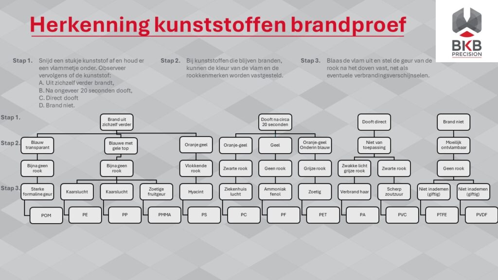Niet alle eerder genoemde kenmerken om kunststoffen te herkennen zijn makkelijk te testen. Als we echt niet vast kunnen stellen welke kunststofsoort het is, gebruiken we binnen BKB Precision de brandproef om de juiste kunststof soort te identificeren. Hierbij gebruiken we de onderstaande grafiek: